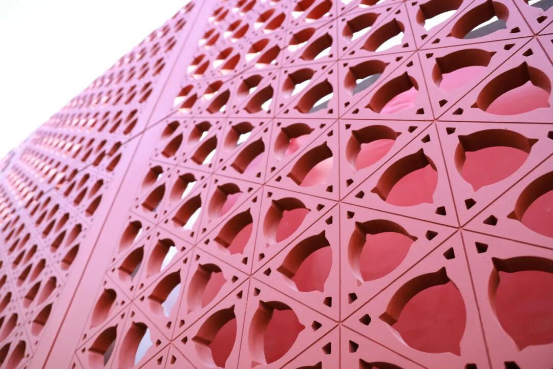 項(xiàng)目采用 “三段式” 古典宮殿結(jié)構(gòu),將太和殿的重檐、中和殿的寶頂、保和殿的屋脊曲線等經(jīng)典意象融入設(shè)計(jì)之中。為還原那抹莊重的 “故宮紅”,項(xiàng)目團(tuán)隊(duì)歷經(jīng) 6 個(gè)月、上百次的配比試驗(yàn),研發(fā)出 UHPC 超高性能混凝土幕墻。該幕墻強(qiáng)度達(dá)常規(guī)混凝土的 3 至 4 倍,且在材料中加入了 304 不銹鋼纖維,有效提升結(jié)構(gòu)抗裂性能,形成對(duì) UHPC 飾面故宮紅的防褪色技術(shù),確保紅墻在百年風(fēng)雨中依舊鮮艷。