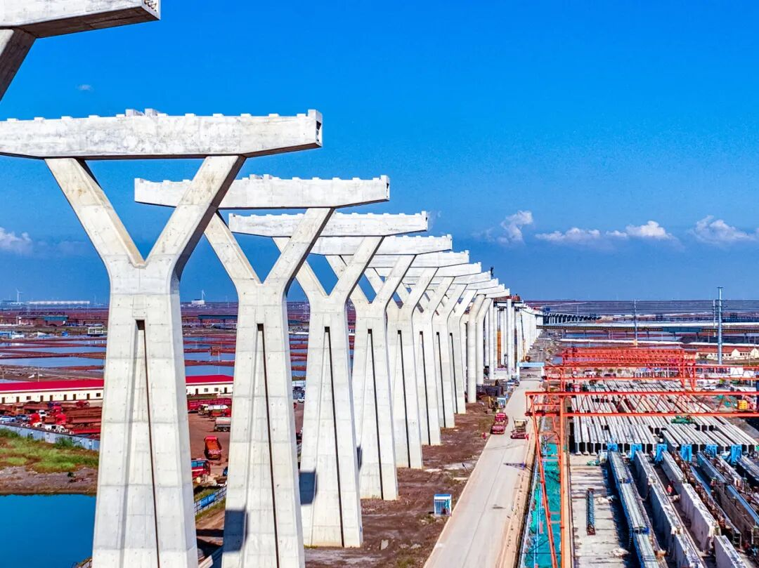 測量期間,項目建設(shè)者參考衛(wèi)星地圖,背著充氣皮筏和測量設(shè)備,步行穿過萬畝灘涂,實現(xiàn)各測量點精準定位。制定“臨時圍堰+永久圍堰”施工方案,隔離施工區(qū)域海水開展路基施工,將永久圍堰作為臨時道路,高峰時上百輛工程機械“入海作業(yè)”,按照“先成段、再成線、連成片”的方式,2個月實現(xiàn)1.6萬米圍堰貫通。
