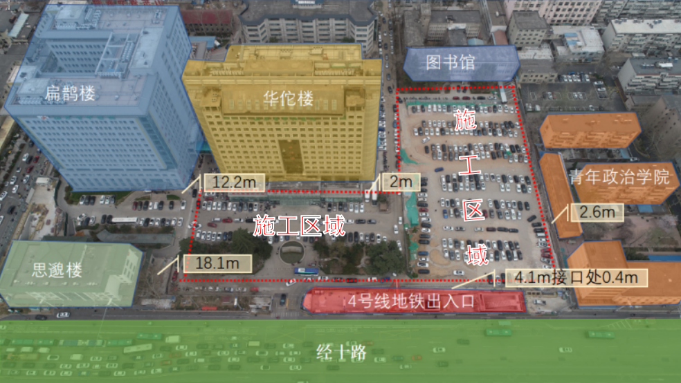 作為國(guó)家 “十四五” 重點(diǎn)建設(shè)項(xiàng)目、山東省重點(diǎn)民生工程及國(guó)家中醫(yī)疫病防治基地,該項(xiàng)目是中建八局一公司與山東中醫(yī)藥大學(xué)附屬醫(yī)院的第四次攜手合作。項(xiàng)目總建筑面積達(dá) 11.26 萬(wàn)平方米,涵蓋體檢中心、潔凈手術(shù)、ICU 等多個(gè)功能區(qū),規(guī)劃床位 810 張,建成后將為區(qū)域醫(yī)療健康保障注入強(qiáng)勁動(dòng)力。然而,項(xiàng)目建設(shè)面臨的挑戰(zhàn)堪稱 “極限”:南側(cè)距地鐵出入口僅 4 米,西側(cè)與醫(yī)院華佗樓間距不足 2 米,東側(cè)、北側(cè)被校園環(huán)繞,場(chǎng)地空間極度受限;同時(shí)地處濟(jì)南富水地層,對(duì)噪音控制、揚(yáng)塵治理及泉脈保護(hù)提出了極高要求。