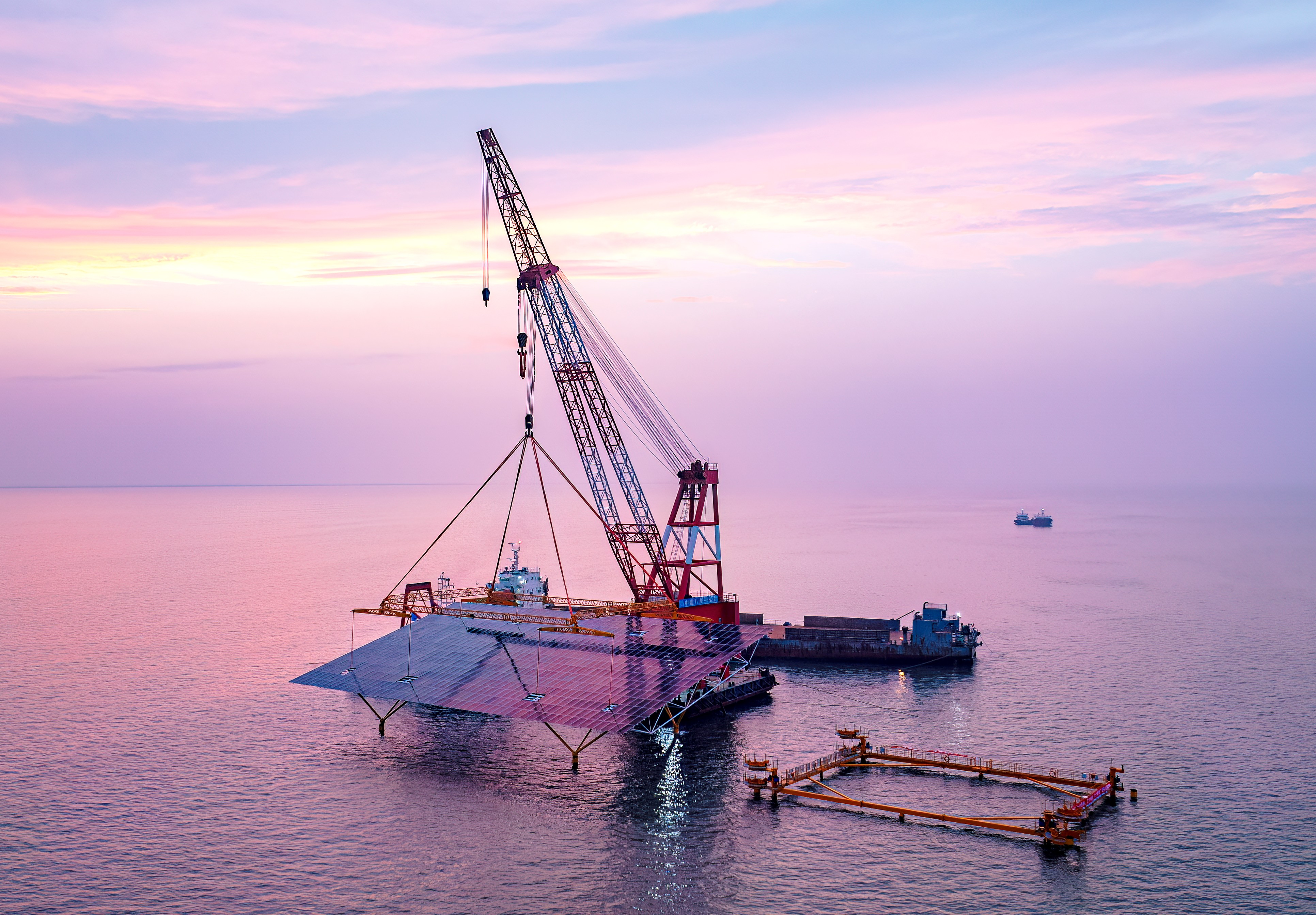 針對施工區(qū)域水位差異,項(xiàng)目采用差異化吊裝技術(shù):深水區(qū)用大型起重船和專用吊具完成平臺吊裝,淺水區(qū)則研發(fā) “浮托法” 運(yùn)輸及安裝技術(shù),實(shí)現(xiàn)風(fēng)浪中毫米級精準(zhǔn)對接。項(xiàng)目累計(jì)吊裝超 7000 次,吊裝鋼結(jié)構(gòu)總量約 7.7 萬噸,高峰時期百余艘船只往來穿梭,4 個碼頭、3 個作業(yè)面同步施工,單套平臺安裝時間縮短至 56 分鐘,可實(shí)現(xiàn)每天 8 套平臺落戶大海。
