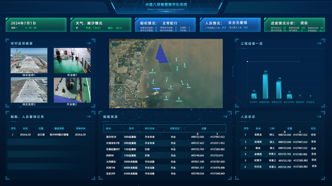 為保障海上施工安全,項(xiàng)目打造海上光伏施工智能監(jiān)管平臺,整合天氣、環(huán)境、人員、船機(jī)、物料等信息,實(shí)現(xiàn)作業(yè)船只航跡監(jiān)控調(diào)度、物料及關(guān)鍵工序進(jìn)度監(jiān)管等功能,達(dá)成管理可視化。同時,項(xiàng)目研發(fā)智能潮位監(jiān)測系統(tǒng)和智能風(fēng)浪預(yù)測系統(tǒng),結(jié)合實(shí)時監(jiān)測與歷史規(guī)律分析實(shí)現(xiàn)高精度趨勢預(yù)測,全面應(yīng)用無人機(jī)和無人船巡檢,構(gòu)建 “天 - 空 - 海 - 地” 全域施工監(jiān)控。此外,項(xiàng)目還研發(fā)自動脫鉤緩降分配吊架以規(guī)避高空解鉤風(fēng)險,為夜間趕潮施工人員配備安全肩燈,守護(hù)作業(yè)安全。